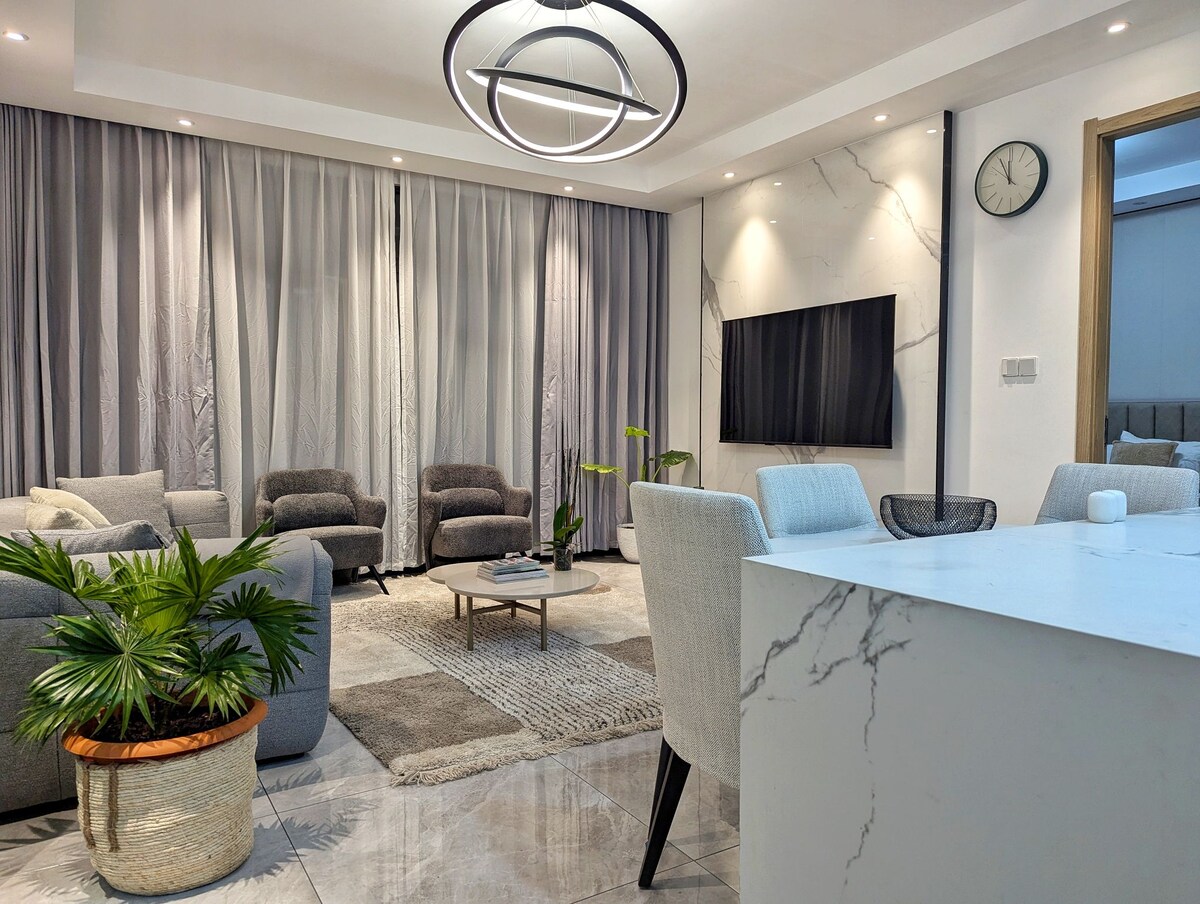 • Stunning apartment fully furnished, within two bedrooms, a living room, a kitchenette area, a bathroom and modern toilets. • It has a large 55” QLED screen with Netflix and WiFi connection. • A day and night guard, a 24/7 cleaning service, secured by an alarm system and an electric fence as well as CCTV cameras. • An electronic generator in the event of a power outage, a water batch, and a private parking.
