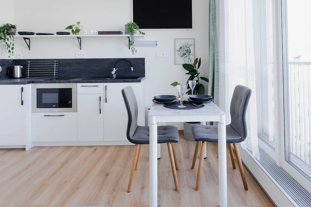 Alójate en un apartamento nuevo y moderno con terraza cerca de Brno, en el centro de Šlapanice. Ya sea que viajes por trabajo o por turismo, aquí te sentirás como en casa. Cocina totalmente equipada con placa de inducción, horno, lavavajillas y cafetera moka. Internet rápido, TV 4K, persianas al aire libre y calefacción por suelo radiante garantizan la comodidad. El baño está equipado con lavadora, secadora y secador de pelo. Con el transporte público, estás en el centro de Brno en 25 minutos y el aeropuerto en 10 minutos en coche.
