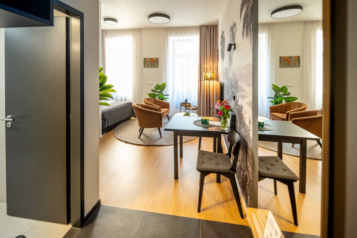 Stay in a generously sized 45 m² studio apartment in the heart of Brno, tucked away in a quiet inner courtyard that offers peace away from street noise. Enjoy Free Underground Parking, a complimentary minibar, and a 24/7 reception for flexible, stress-free arrival. This brand-new premium studio-apartment in the Pekárenský Dvůr residence features a fully equipped kitchen, custom-built-in furniture, fast Wi-Fi, gym access, an excellent bakery/café on site, and optional wellness services.