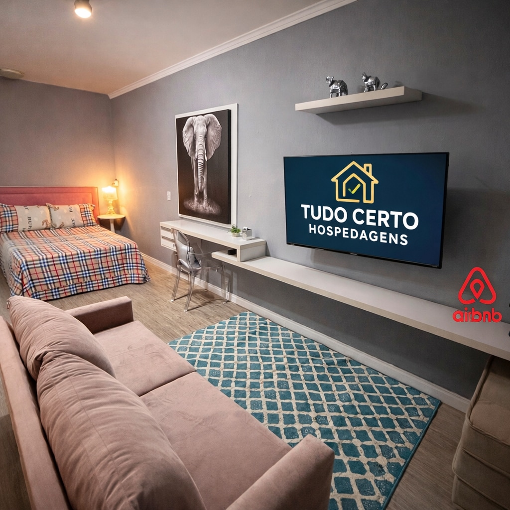 Sofisticado apartamento tipo estudio ubicado a 800 metros del parque Vila Germânica, lugar de eventos como el Oktoberfest. Rodeado de restaurantes, bares y supermercados. Todo para su comodidad: Smart TV 50" Samsung, aire acondicionado split, ducha de gas, wifi fibra 240mb, cocina completa con heladera Brastemp, microondas, horno, estufa, campana extractora, cafetera, purificador de agua, lava y seca, armarios, y por supuesto ¡una cama queen con el mejor colchón!