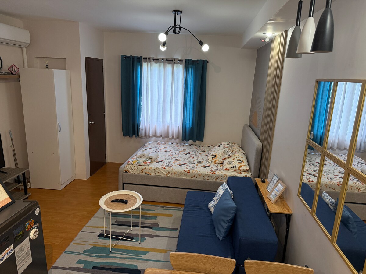 Our studio unit is located on the 21st floor, offering a stunning city view. The space includes a Full Double Bed (sleeps 2), extra double foam (sleeps 2). It has a compact kitchen equipped with a refrigerator, microwave, cooking wares, and a range hood. The living area features a sofa, cable TV, and fast Wi-Fi. The bathroom includes a hot shower, towels, and guest essentials. The space is cozy, modern, and designed for comfort, making it perfect for both short and extended stays.