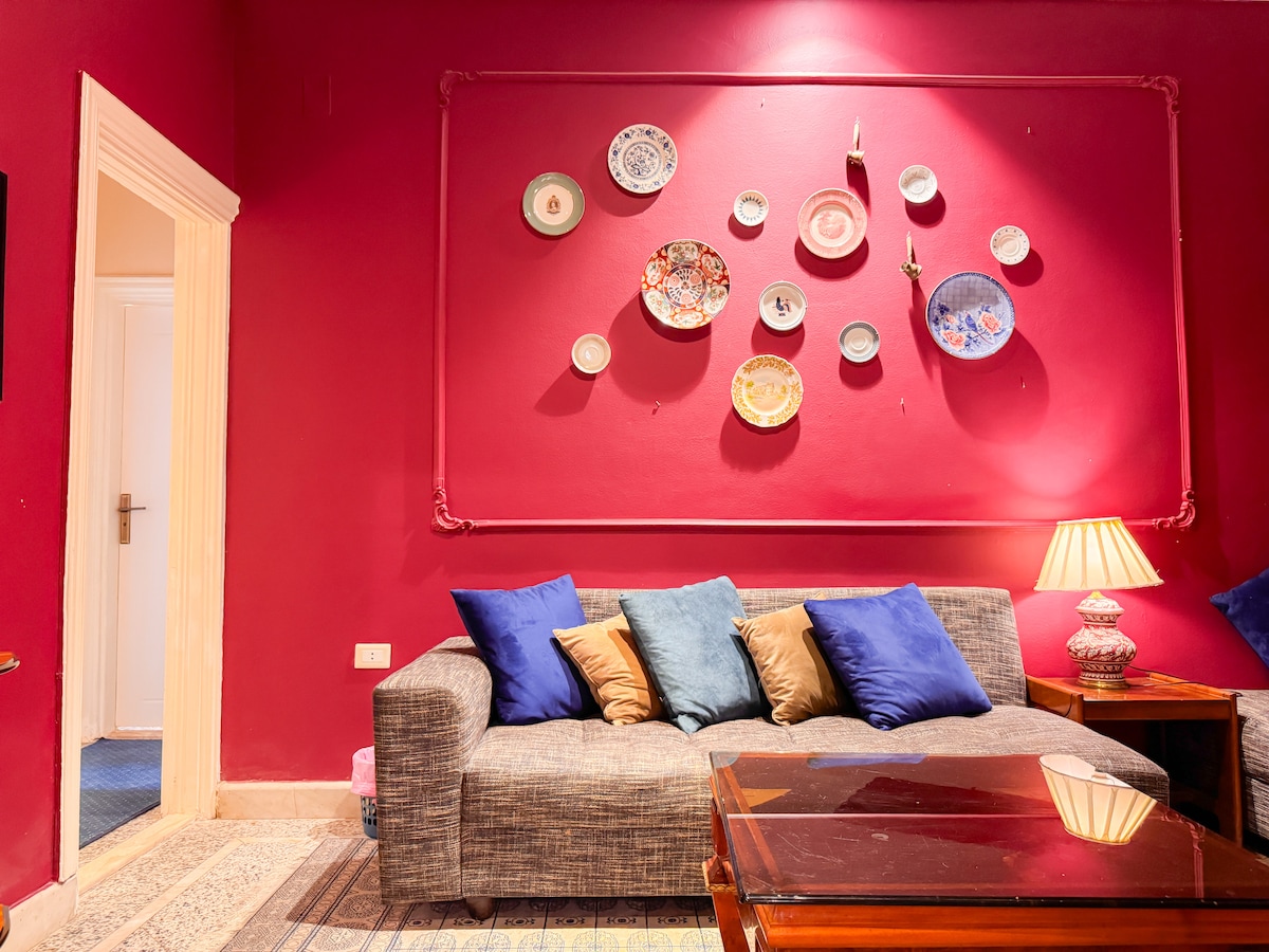 Located in the Sakakini historical building! Nested in the heart of Cairo, places you just steps away from vibrant markets, trendy cafés, and some of the city’s most iconic landmarks. 🏛️ 5' minutes to the Egyptian Museum/ Tahrir square 🚇 5' minutes walk to Metro Station ✈️20' minutes to New Cairo/ Airport 🛕20' minutes to the Pyramids Natural light streaming through 3 large, sunny panoramic balconies and 7 panoramic colored windows.