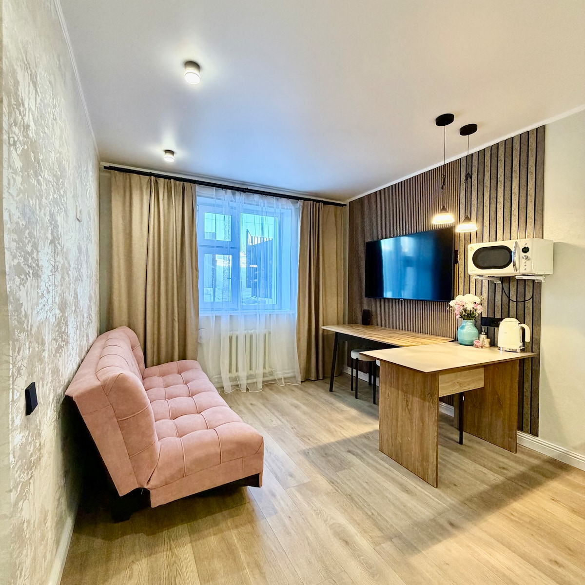 Alójate con tu familia en el centro, cerca de los lugares de interés en un estudio de un dormitorio con vidrieras al sur. Espera: - Departamento luminoso, acogedor y perfectamente limpio con ropa de cama blanca como la nieve. Todo está disponible para una estancia cómoda: - Televisión inteligente - Cocina pequeña totalmente equipada. - Bebidas ilimitadas: café, té negro para tu estancia. El número máximo de huéspedes es de tres, dos adultos y un niño menor de 6-7 años.