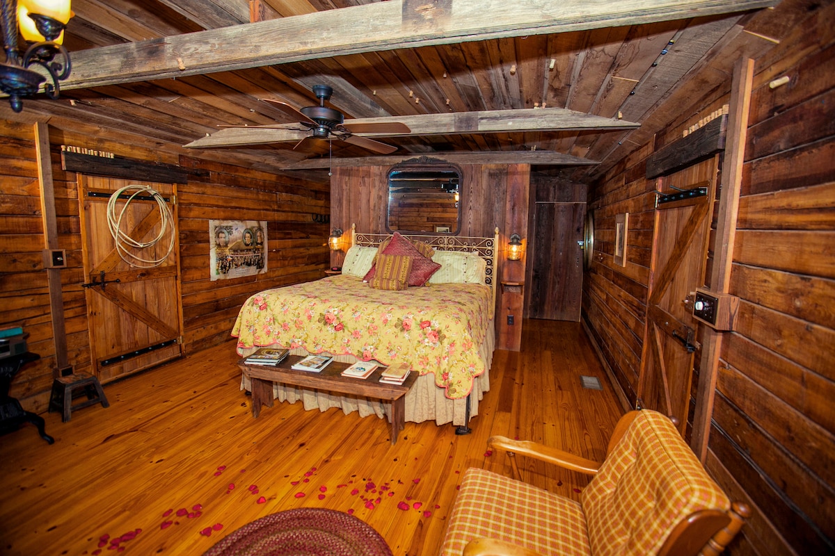 Nuestro granero occidental hecho de madera de granero de principios de siglo. Esta cabaña se completa con una bañera de hidromasaje con forma de corazón para dos personas detrás de las cortinas y a pocos pasos de una cómoda cama tamaño queen. Aventúrate en el porche trasero y disfruta de los sonidos del aire libre en los balancines del porche. O disfruta de tu propio puesto de ducha privado y extragrande para dos personas, aislado en el porche también. Luego selecciona una novela occidental de nuestra colección de libros y relájate en las sillas del rancho.