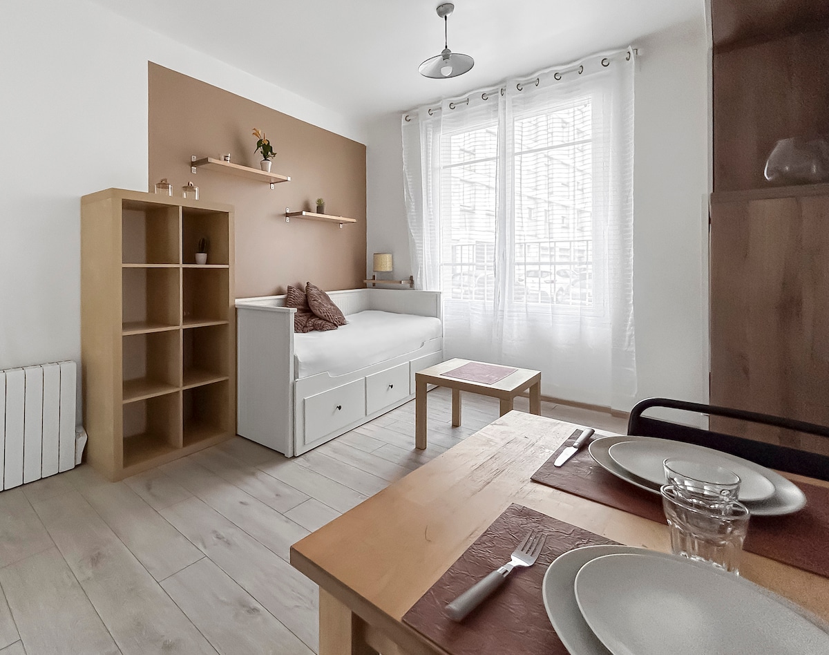 Estudio de 20 m² para 2 viajeros, bien equipado, a 10 minutos a pie del centro peatonal de Saintes. Junto a nuestra casa, tiene una plaza de estacionamiento en el jardín. Compuesto por una habitación principal con cocina americana y sofá cama, baño con inodoro triturador. Se proporciona ropa de cama y toallas, mesas y sillas disponibles en el jardín. Altura de ducha reducida, cómoda para un viajero de menos de 1,85 m. Cicloturistas, sus bicicletas podrán dormir a cubierto, recarga posible.