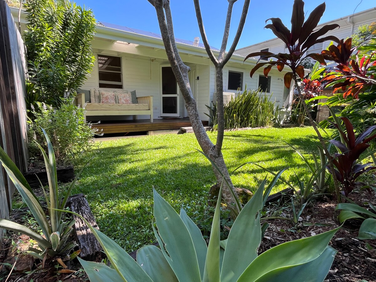 Aircon studio cabin, bikes, fenced off private pet friendly yard. Stroll to Tallow Beach, easy 15mins flat walk to Byron CBD. Style is mix of vintage/upcycled/recycled. Cosy self contained cabin with private access behind owners home screened/fenced off. 1 queen bed+single bed (trundle) used as day bed/lounge when not used as single bed. Private garden with birdlife + firepit (winter months use only). Bikes available.