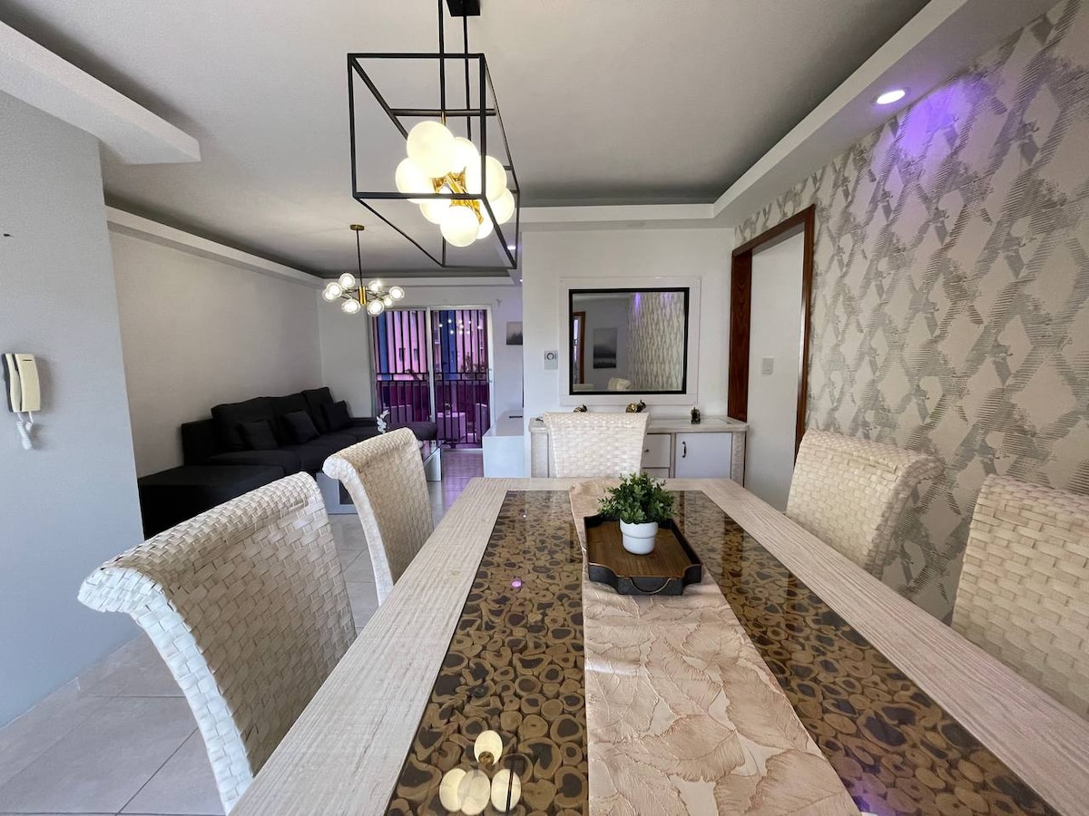 Vuelve a conectarte con tus seres queridos en este alojamiento ideal para familias. El apartamento es un Penthhouse en un cuarto piso, no cuenta con ascensor. Apto para estadía familiar, de negocio o romántica. Cuenta con mesa de billar y dominó, equipos de ejercicio y pesca de entrenamiento. Terraza con bbq? jacuzzi, televisor, míni fregadero y barra ( sin bebidas).