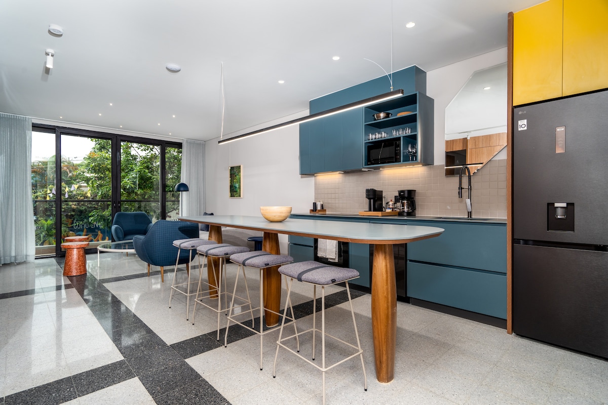 🌴 EXSTR Apartment • Hygge Deluxe 202 Brand-new 2-bed, 2-bath haven 1 block from Granada’s vibrant dining. King beds, AC, soundproof windows, Nespresso, washer/dryer, dedicated fiber optic Wi-Fi connection, and 24/7 security. Enjoy a balcony, complimentary welcome drinks in the fridge, dual workspaces, and parking. One of Cali’s most complete rentals, we thought of EVERYTHING for work, family, or friends. Free city tour included! Book now to assure a wonderful stay in Cali.