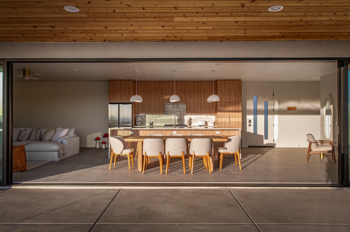 Propiedad personalizada con temática de spa en 30 acres, a solo 4 millas del centro de Joshua Tree. Destacado en Travel + Leisure, Domino, San Diego Mag y más. Sin vecinos inmediatos, podés relajarte de verdad. Mirá por las ventanas gigantes hacia más de 100 árboles de Josué y el parque nacional. Las comodidades incluyen una nueva pileta y terraza, sauna personalizada de gran tamaño, inmersión en frío, jacuzzi para 8 personas, edificio separado para yoga/comedor grupal, ducha al aire libre, cocina de chef, cargador de vehículos eléctricos, fogata sin humo y un campo de golf de disco privado.