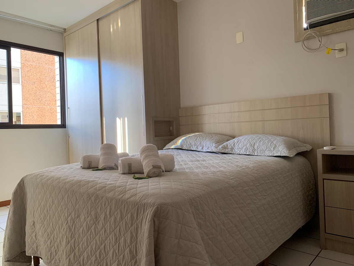 Departamento con 2 dormitorios, 1 de ellos suite. Tiene 1 cama queen, 1 cama doble, 1 cama individual. La propiedad se encuentra en una zona privilegiada de Vitória, cerca de Shopping Vitória, panaderías, bares, restaurantes, mercado, playa de Guarderia y Curva da Jurema. El departamento es muy acogedor y nuestro conserje está abierto 24 horas. El edificio tiene un mini mercado en la azotea. Espacio El apartamento está completo, incluido el aire acondicionado en las dos habitaciones. Otras notas: Proporciono ropa de cama y toallas.