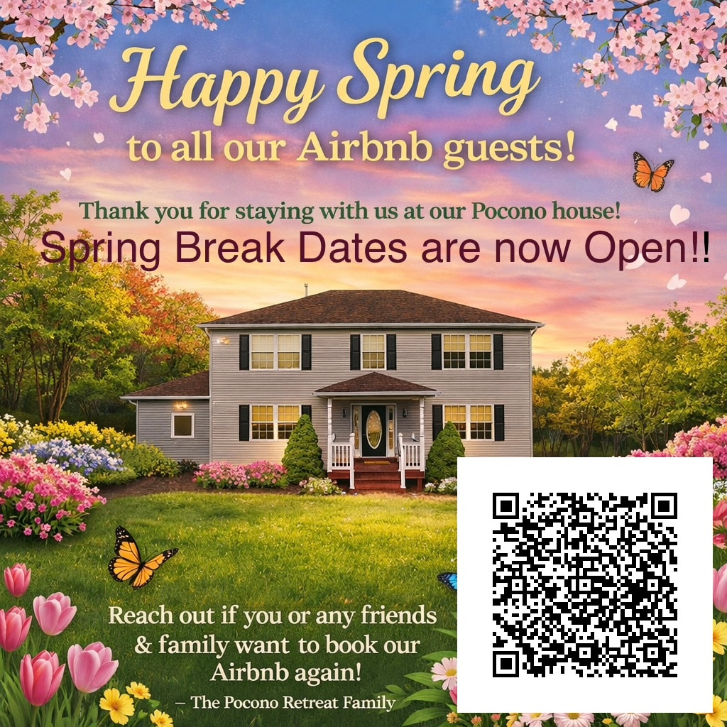 Bienvenido a tu hogar lejos de casa en esta casa de 4 dormitorios y 3 baños de nuevo diseño en la comunidad cerrada de Penn Estates, Pensilvania. A solo 15 minutos de la estación de esquí Camelback Mountain, tiendas y restaurantes. Disfruta de vistas a la naturaleza, paseos al lago, diversión en la sala de juegos y frecuentes visitas de ciervos y vida silvestre. Experimenta la calidez y el encanto de un hogar que ha creado hermosos recuerdos para muchos, con mucho espacio para la relajación y la aventura en un entorno tranquilo.