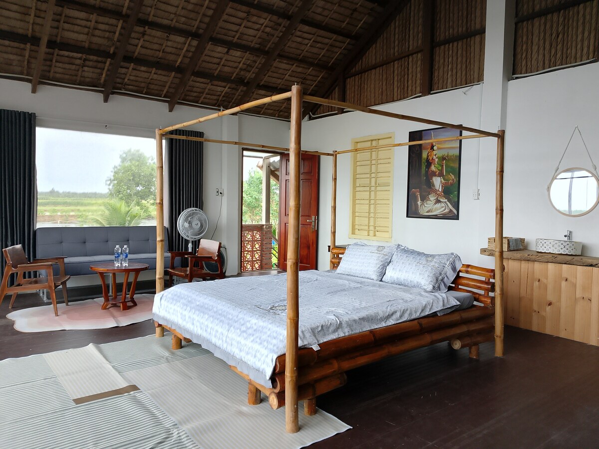 Con una superficie construida de 300 m2 y un terreno de 1000 m2 justo al lado de la hermosa orilla del río. La villa está diseñada en un estilo abierto, creando una sensación de inmersión en la naturaleza y desde el living de la villa se puede tener una vista del paseo marítimo para ver pasar los barcos de todos los tamaños con una sensación muy grande. A partir del 1 de agosto de 2025, hemos completado la adición de tiendas de campaña DOME en la terraza de la azotea de la villa y esto dará una experiencia sin precedentes cuando vengas al delta del Mekong.