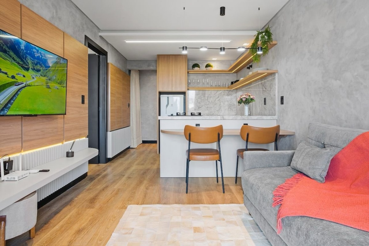 🎅🏽Divirta-se no Natal da Serra Gaúcha e recarregue as energias neste charmoso flat em Canela, com vista espetacular da Catedral de Pedra. Decoração sofisticada, cozinha equipada, lareira acolhedora e quarto iluminado naturalmente, acomoda até 4 pessoas+1criança de até 2 anos. Oferece Wi-Fi, SmartTV e ar-condicionado. O prédio dispõe de piscina aquecida, sauna, playground e academia. Localização estratégica, a 5 min de carro de restaurantes, cafés e atrações. Perfeito para casais e famílias.