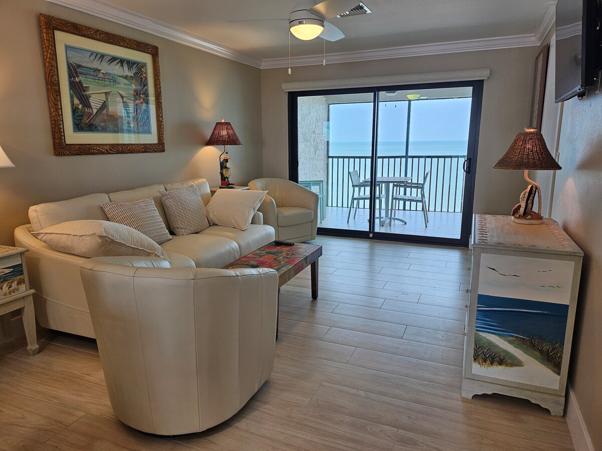 Luminoso, limpio, espacioso, bien decorado y recientemente remodelado, este condominio 2 BR cuenta con un concepto abierto. La cocina totalmente equipada y bellamente renovada con encimeras de cuarzo y electrodomésticos nuevos viene con lavavajillas y utensilios de cocina para que puedas preparar todas tus comidas o disfrutar de la comida para llevar. El diseño del piso abierto ofrece vistas al golfo desde la sala de estar y el dormitorio principal. Para una cena más formal, hay una mesa para 4 personas. En la sala de estar, encontrarás muchos asientos cómodos y un televisor montado en la pared.