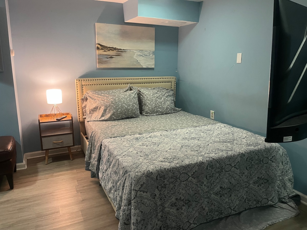 🎁 🌲Cozy Holiday Oasis **Alexa enabled!** Enjoy a quiet, private, holiday getaway with a king bed, off-street parking, patio, HUGE Projector in room TV, full bath, and hassle-free parking— safe and ideal for 🧳 solo travelers or couples and 🩺 Perfect for Traveling Nurses! - 1 mile from Northwest Stadium, home to Commanders games and major concerts. - 2 miles from UMUC (University of Maryland Global Campus) - 9 miles from UMD (University of Maryland)