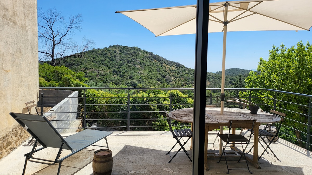 En un pueblo en el sur de Francia, bonita casa independiente de 80 m2 con terraza de 75 m2 sin frente con vistas panorámicas del Canigó dando al turismo mar con un entorno rico . Ruta de los Vinos senderismo , lago ... En asociación con el Hotel Cave -Restaurant Riberach la oportunidad de beneficiarse de reserva de servicios adicionales ( desayuno y Spa, y Spa almuerzo, té y acceso al spa con sauna, baño turco , jardines y piscina ) .