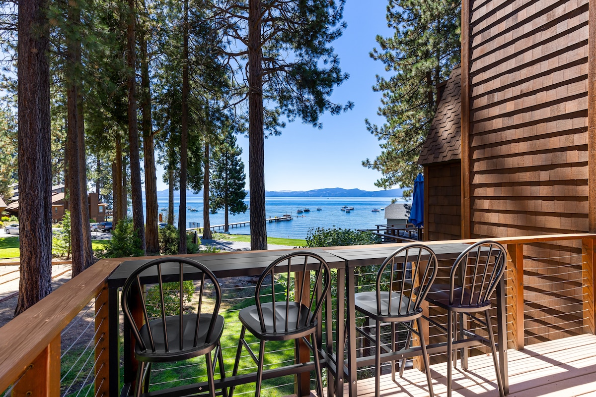 Preciosa unidad de 3 dormitorios y 2,5 baños remodelada en el extremo de Star Harbor Tahoe City con amarre para barcos y aparcamiento techado para boyas, complejo frente al lago, canchas de tenis, pickle ball, piscina, muelle, playa, a una milla de Tahoe City, cerca de Palisades Tahoe (Squaw Valley). Cocina de ensueño, ducha de vapor, tres balcones, hermosas vistas al lago.