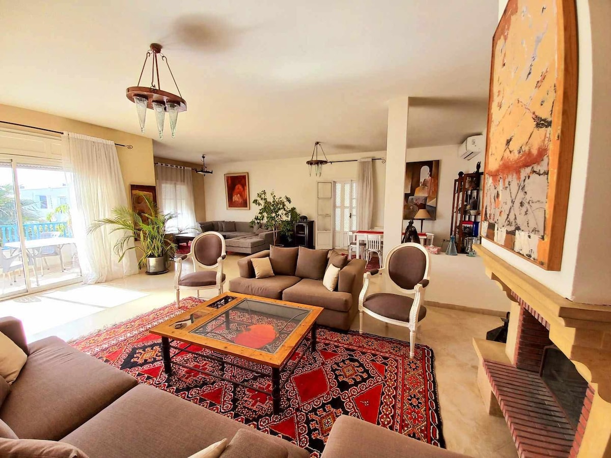 En Sidi Bou Saïd, en un remanso de silencio y luz, este gran luminoso S1 mezcla tradición árabe-andaluza y comodidad moderna. Chimenea, terraza florida, arcos, zelliges y muebles artesanales crean un ambiente único. Cocina equipada, Wi‑Fi de alta velocidad,TV con todos los canales ,películas y series, ropa de cama cuidada. En 15 minutos a pie: callejuelas azules, cafeterías, mar y sabores locales. Ideal para crear, reponer energías, evadirse o simplemente respirar.