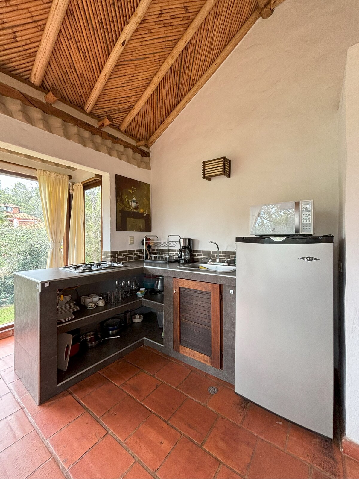 Espectacular cabaña a 5 minutos en auto (15 a pie) de la plaza principal, con cama king, wifi fibra óptica, TV, cocina equipada, nevera, comedor, baño privado con agua caliente y teleducha, fibra óptica, terraza con sillas y amplia zona para parquear. Pet-friendly, ¡mascotas bienvenidas! Ideal para escapadas románticas o descanso en la naturaleza, con vistas increíbles a la Plaza de Villa de Leyva y el Valle de Tenza. Anfitriones serviciales y dispuestos para ayudarte con lo que necesites.