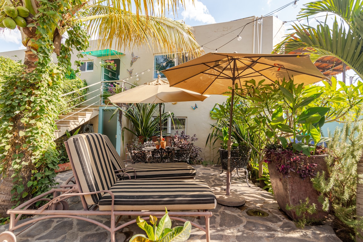 La casita esta totalmente renovada, perfecta casa de huéspedes dentro de la propiedad conocida como Casa Iguana que se ubica a cuadras del centro del pueblo. La casita tiene su propio patio en el frente privado. La ubicación es perfecta a cuadras de: restaurantes, gimnasio, supermercado, cafes, cines, etc,. Tiene su estacionamiento propio, seguro y privado. Huéspedes tienen acceso a la cancha de tenis/Pickle Ball (tenis propios para tenis requeridos), piscina y al jardín. Disfruten.
