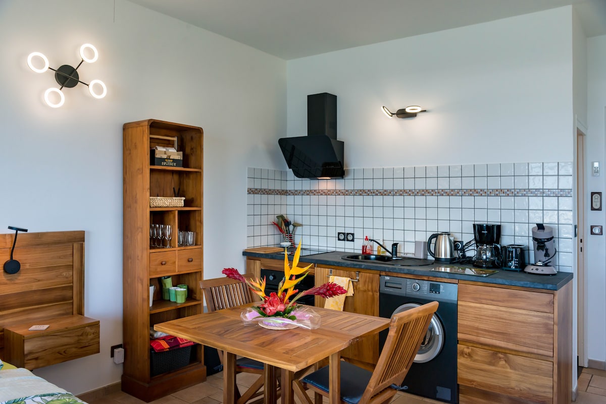 Estudio totalmente equipado con aire acondicionado con cocina con cafetera Nespresso, baño con ducha italiana, inodoro, estacionamiento privado, vestidor, pequeña sala de estar, wifi, televisión, 2 terrazas exteriores privadas, una en la entrada cerca del spa con una sala de estar y otra inmersa en el bosque. Está en un nido aislado del mundo en la fauna y flora de Reunión. Posibilidad de aparcar su vehículo de forma segura en el patio. Acceso al spa totalmente privatizado