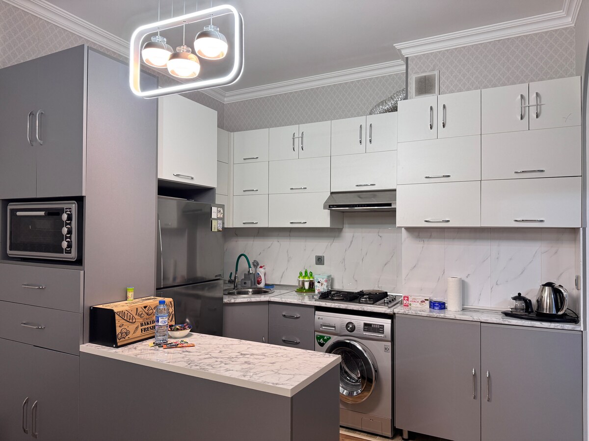 Quedate en un departamento moderno en un piso alto de un complejo residencial premium en Bakú. Ubicación y acceso: • A poca distancia del metro y de las paradas de autobús para acceder fácilmente a todo Bakú. • Cerca de tiendas, restaurantes y servicios locales. Servicios: • Supermercado, restaurante, salón de uñas y gimnasio en el lugar. • Seguridad las 24 horas del día, 7 días a la semana y estacionamiento para tu tranquilidad. Superanfitrión: Tengo una calificación de 4,7 y evaluaciones excelentes. A los huéspedes les encanta mi hospitalidad. ¡Acá podés esperar la misma experiencia de alta calidad!