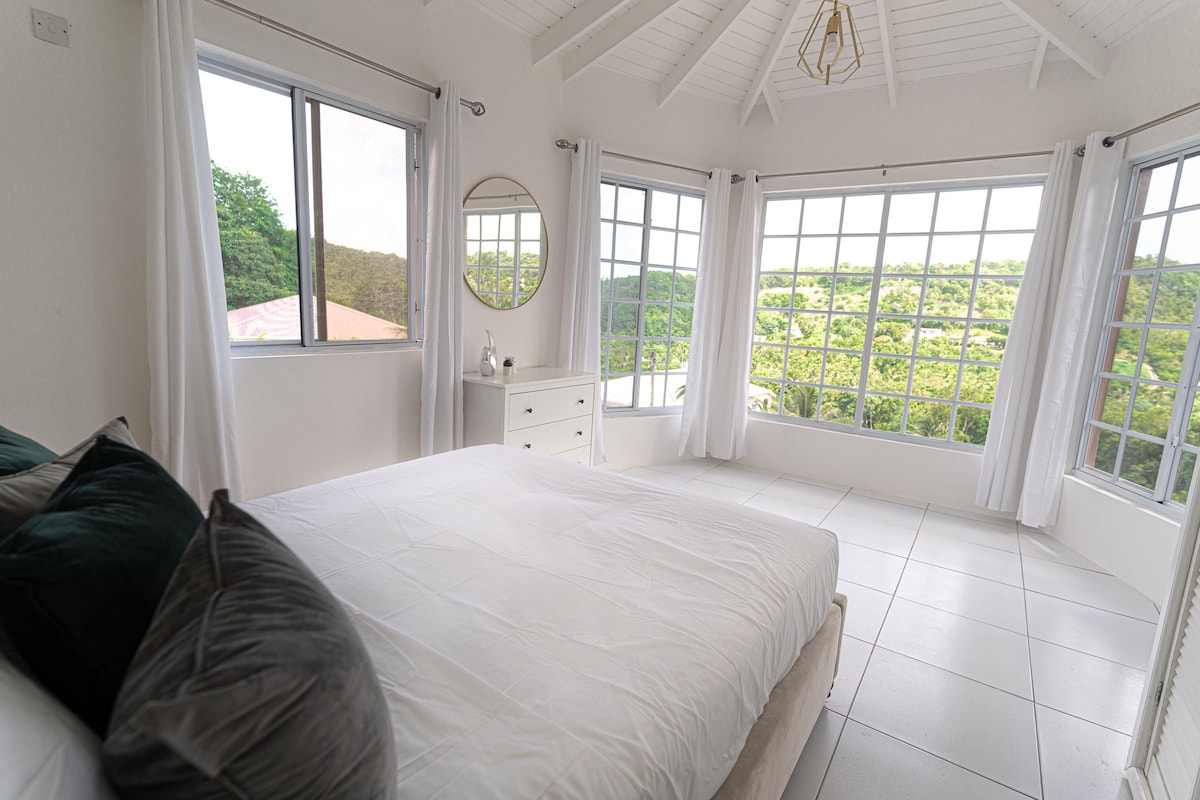 Una de las 3 suites (consulta mi perfil para ver otras suites) dentro de nuestra casa familiar, ubicada en 4 acres de tierra tropical con magníficas vistas al norte y a la isla vecina de Martinica. Disfruta de los atardeceres más increíbles en el amplio patio. A pesar de su tranquilidad, la propiedad está idealmente ubicada a menos de 10 minutos en coche de la ciudad y de algunas playas. A 2 minutos a pie por nuestra entrada y estarás en la ruta del autobús. A 10 minutos a pie hay una panadería, un minimercado, bares, restaurantes y furgonetas de comida.