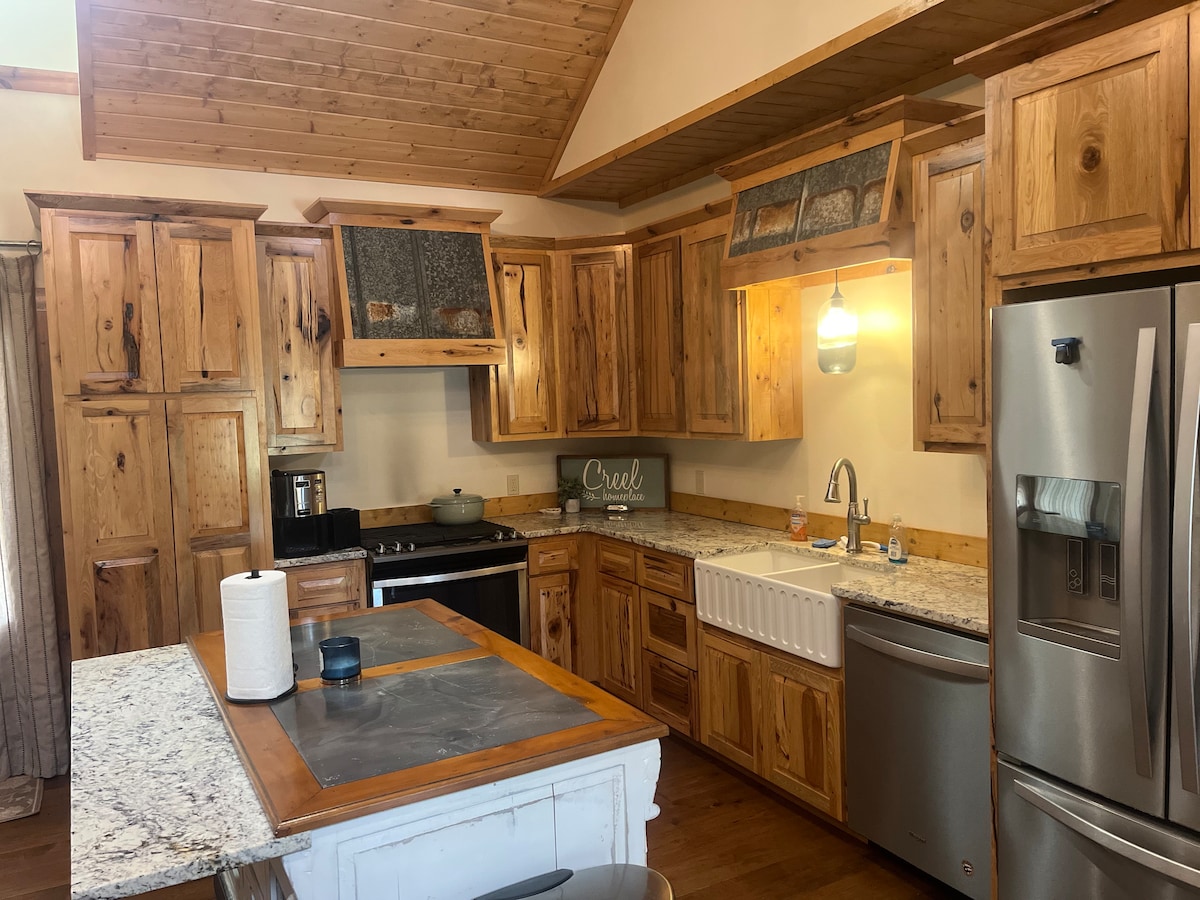 En Paradise Lodge, disfrutarás de la serenidad de la vida en el campo mientras disfrutas de una impresionante casa de dos pisos con 3 dormitorios y 3 baños. Nuestra casa de ensueño puede ser tuya durante tu estancia. Disfruta de la exquisita artesanía de nuestra escalera de roble reciclado o siéntate en el columpio del porche trasero y escucha los serenos sonidos del bosque que hay detrás de la casa. Una sala de estar con cocina abierta permitirá que tu familia disfrute de los demás, ¡y los 3 dormitorios le dan a todos su espacio! ¡Ven y quédate en nuestro albergue!