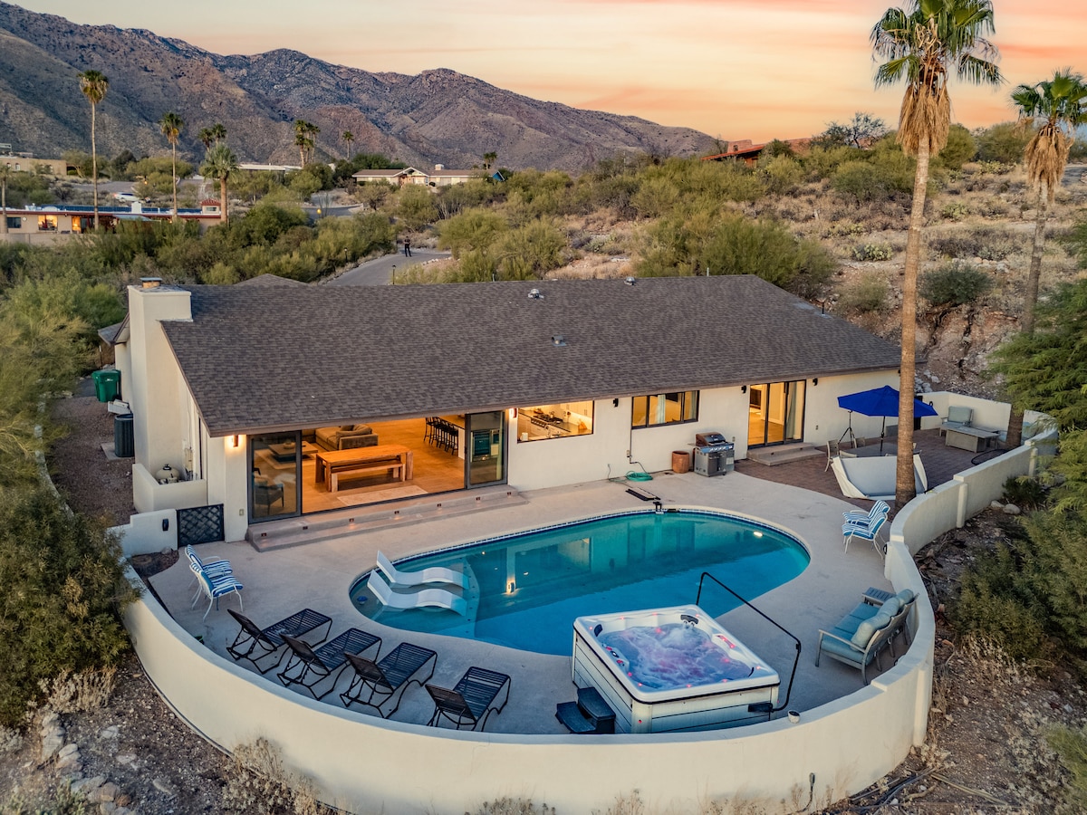 ¡Rejuvenece en la única casa del barrio que ofrece vistas ininterrumpidas a las montañas Cathalina y a toda la ciudad de Tucson! ¡Este alojamiento ofrece una vida sostenible, con una conexión totalmente interior/exterior, piscina, jacuzzi y una increíble privacidad! La casa luminosa y espaciosa cuenta con una sala de estar de planta abierta y ventanas de gran tamaño para maximizar las impresionantes vistas. Disfruta de bebidas en el patio y un atardecer. Por la noche, enciende una fogata en la chimenea al aire libre y relájate en una tumbona bajo las estrellas.