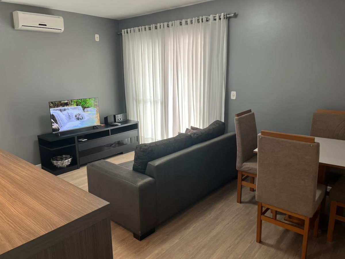 Apartamento nuevo, amueblado, limpio, equipado con lo mejor para su estadía, muy cómodo, con excelente ubicación, en el Centro de Santo êlo. Cerca de supermercados, restaurantes y tiendas. Incluye plaza de garaje con puerta electrónica. El apartamento cuenta con: aire acondicionado split, duchas, cama doble, Wi-Fi, microondas, lavadora (compartida) y utensilios de cocina. No se permiten visitantes en el apartamento.