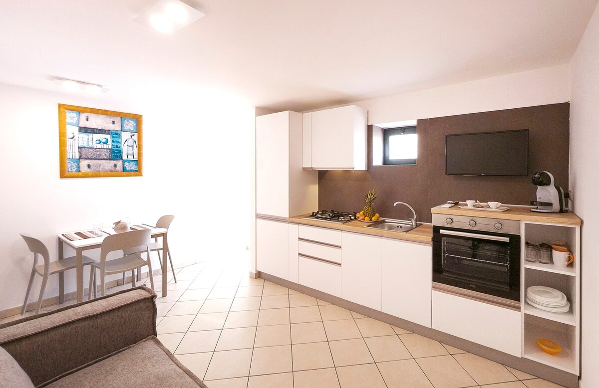 Newly built apartment, just 3 minutes on foot from the beach. The apartment has a bedroom with queen bed and a big living room with kitchen. In the living room there is s also a bed sofa. The apartment can host 4 persons. The kitchen is very comfortable and includes: microwave, oven, dishwasher and laundry washer. Car parking is inside and for free. There is also a barbecue area, a big garden and also a yard (with external table and chairs).