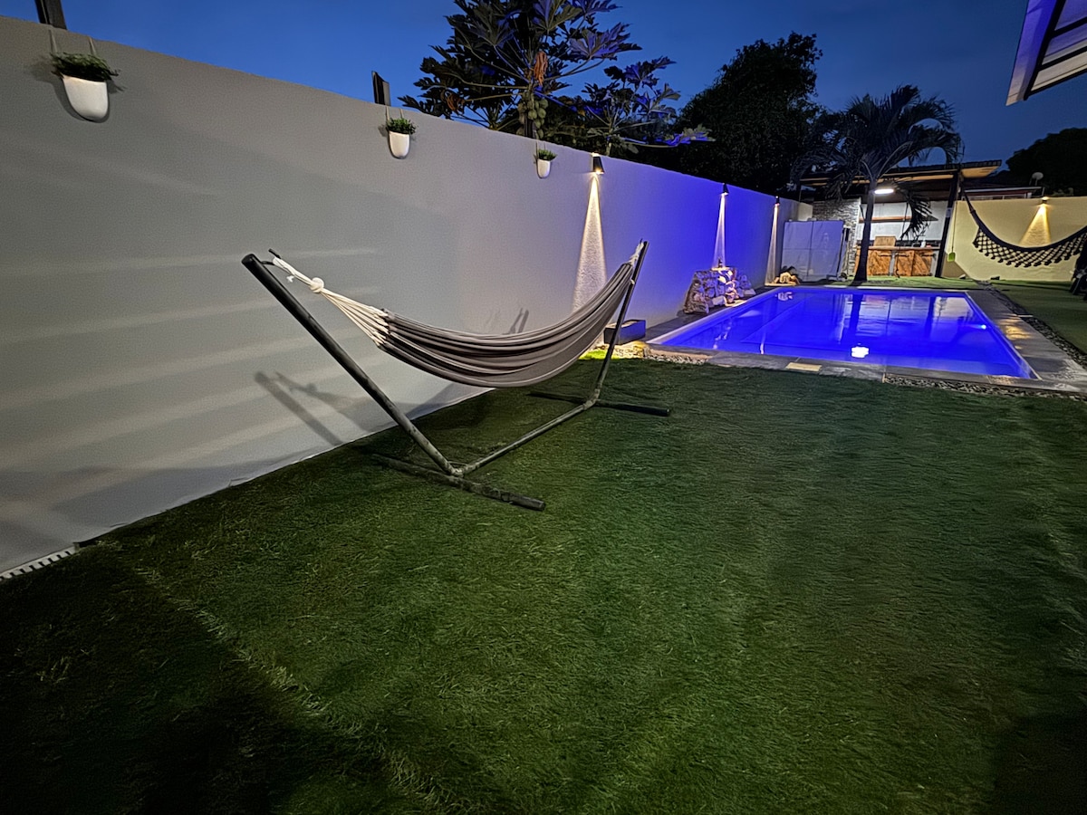 Logement idéal pour tous vos séjours: de loisir ou professionnel ! Il est situé à proximité de toutes les commodités nécessaires ! Cette villa offre : - Une chambre avec lit double, climatisation, télévision, penderie, salle de bain - Salon-salle à manger avec canapé-lit, climatisation, télévision - Cuisine équipée avec machine à café, bouilloire, grille pain, four, réfrigérateur, … et lave linge - Piscine privée avec hamacs et mobilier - Cuisine extérieure avec barbecue - Parking privé