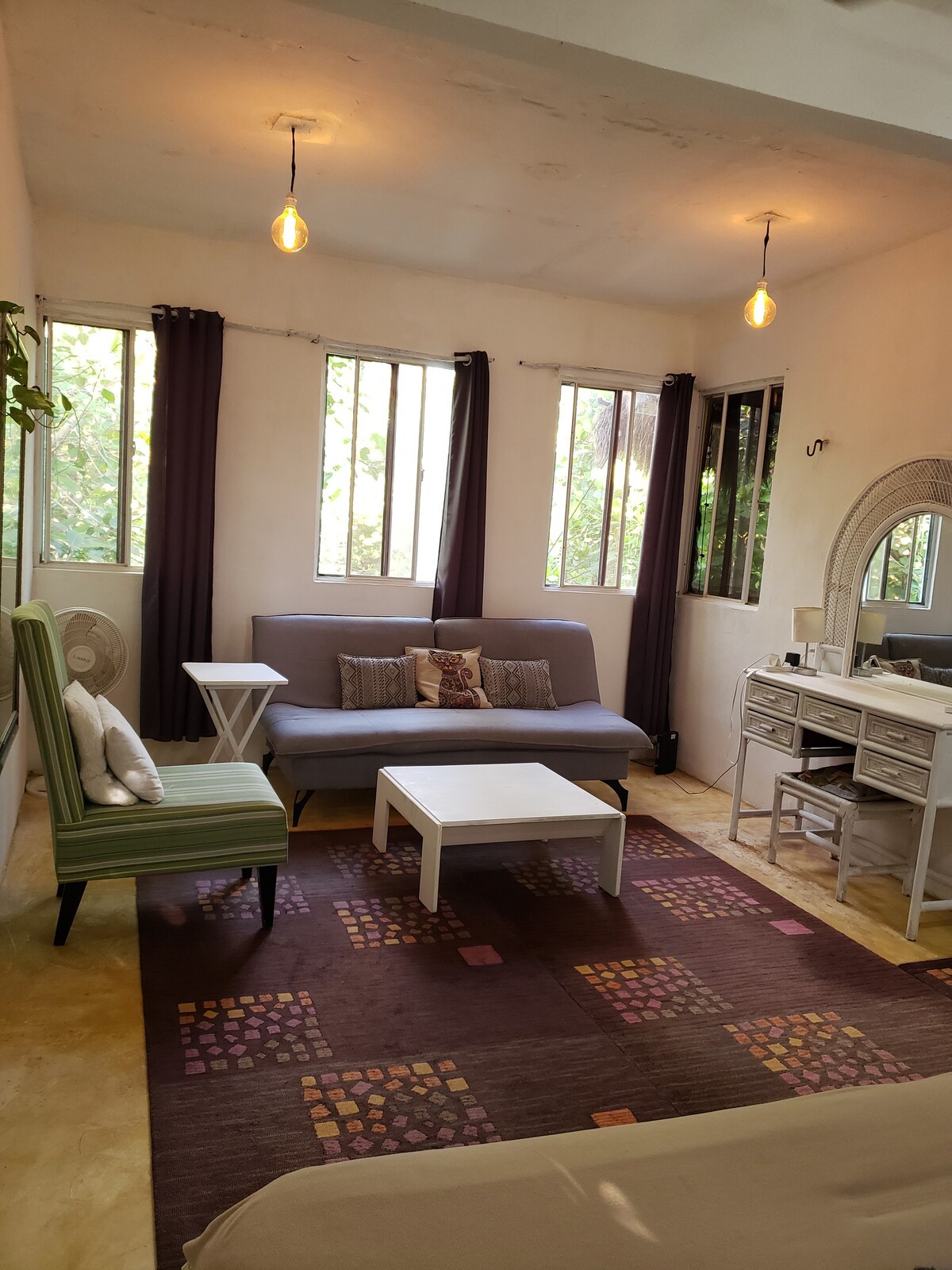 Hermoso estudio, con preciosos detalles mexicanos, pisos de mármol frescos e iluminación acogedora. Cuenta con cama King-size ideal para parejas, con sabanas de alta calidad para un perfecto y reparador descanso. Cocineta equipada, cafetera, microondas. El área de balcón cuenta con una mesa para disfrutar amaneceres y atardeceres inolvidables, disfruta de Smart TV de 50", A/C mini Split, conexión WIFI de alta velocidad, accesos digitales al edificio habitaciones y área de lavado, entre otros.