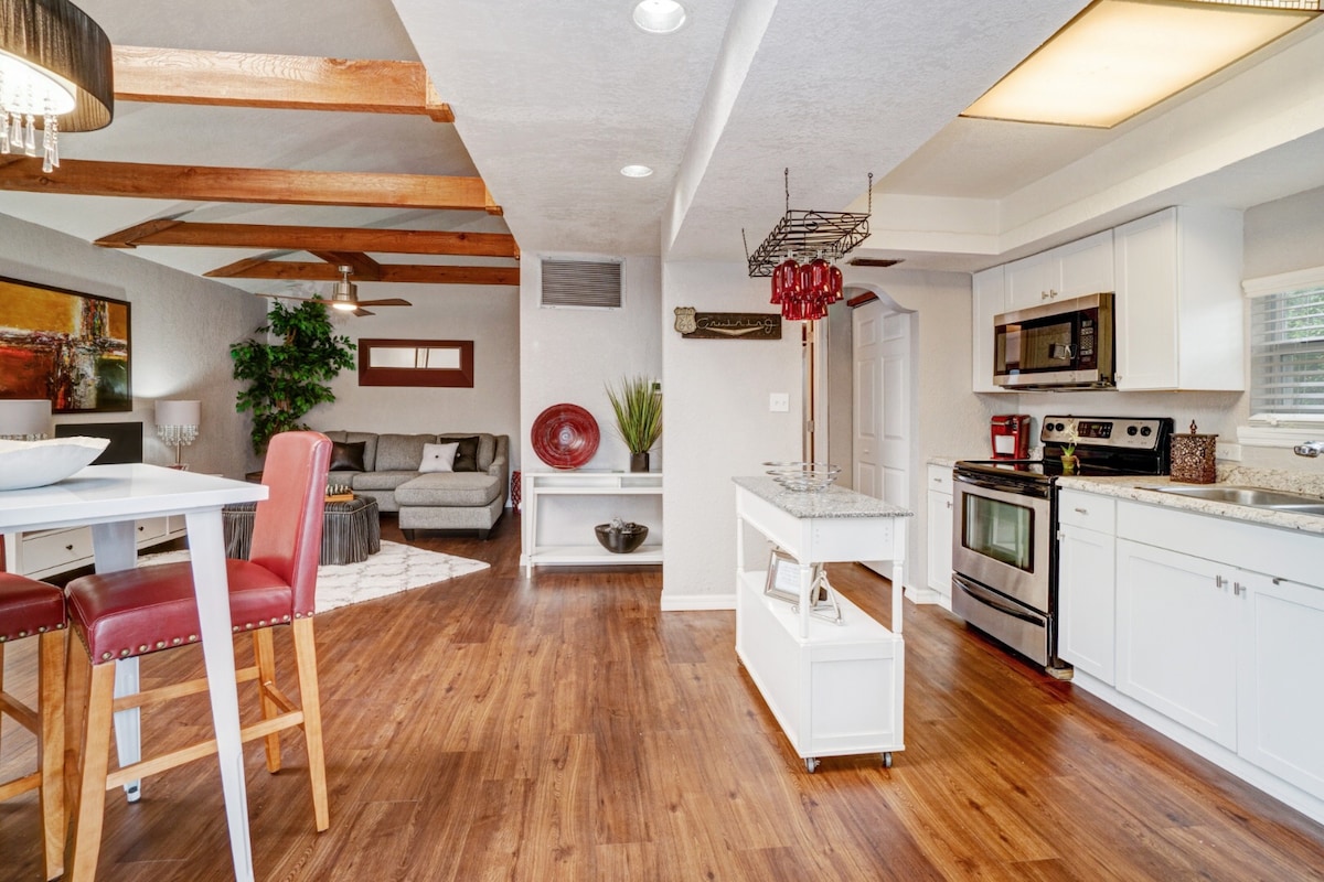 Quedate en este loft bellamente decorado ubicado en el corazón del centro de Orlando. Una cómoda cama tamaño queen con colchón de espuma viscoelástica y un sofá cama de tamaño completo pueden alojar cómodamente a 4 personas. El loft de concepto abierto tiene una cocina moderna bien equipada que permite a los huéspedes cocinar su comida favorita o disfrutar de comida para llevar de uno de los restaurantes mejor calificados de la zona. Un comedor separado te da mucho espacio para relajarte y disfrutar de tu café de la mañana, o ver Netflix en el televisor de pared de 55".