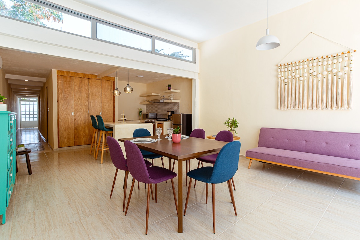 Comfortable casa en el Centro de Merida, Yucatan, a 10 calles de la plaza mayor. Ideal para parejas, y grupos de 4 personas. Adultas o niños. Ideal para pasearpor el centro de Merida y quieran llegar a un sitio cómodo y único para ellos, sin interrupciones. Cuenta con cocina y comedor equipado completamente, baño, una recámara principal para dos personas y un área común con un sofa cama para dos personas extra. Piscina en la terraza trasera de la casa.