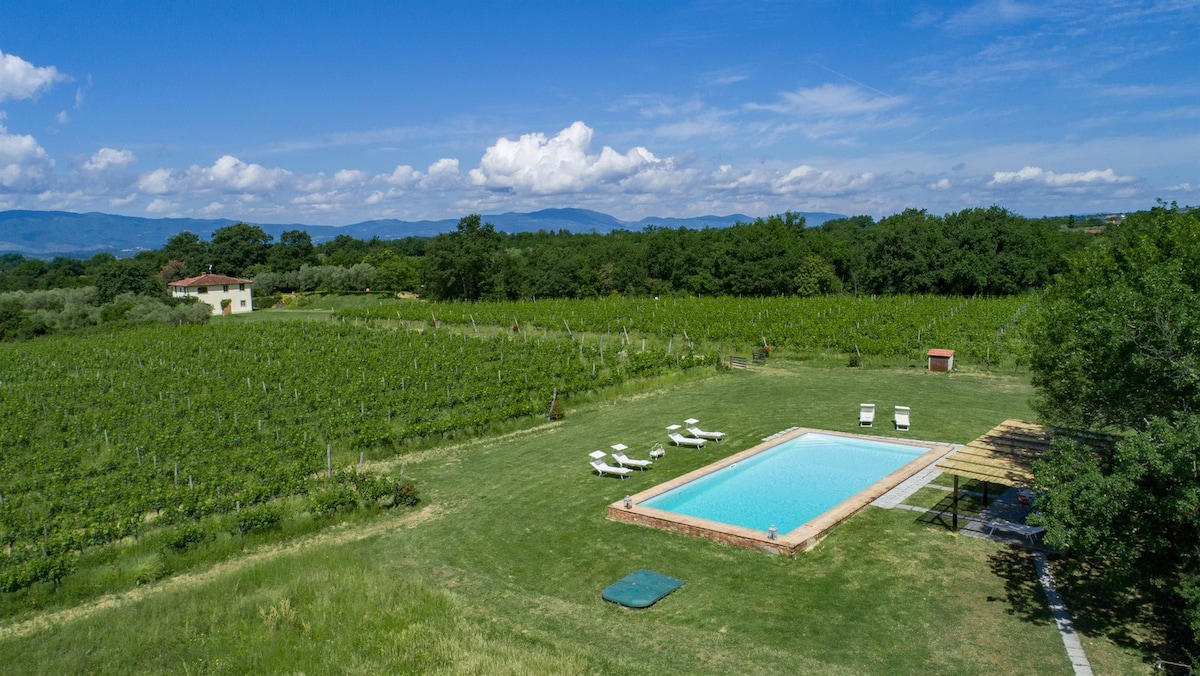 Perched on a hillside above the Valdarno area, between the cities of Florence, Arezzo and Siena, the Lazy Oak villa is surrounded by acres of olive groves. The main house on two level has been fitted with bedrooms, bathrooms and new kitchen whilst retaining its old terracotta floors and beamed ceilings. A dining loggia for al fresco meals enjoys a breathtaking view of the countryside. The infinity pool is set just a few steps from the house on a green terrace furnished with loungers.