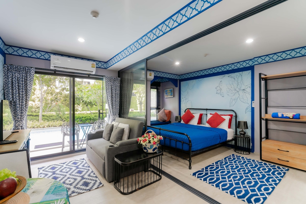 Cozy 1BR pool-view suite (34 sqm.) with balcony on a high-floor with a private washing machine Just 250m from the beach. Smart TV & Wi-Fi (Netflix-ready), and free capsule coffee machine & bathroom amenities. 🌴 Steps from Cicada & Tamarind Night Markets (200m), 7-Eleven (100m), and a short drive to malls, hospital & Hua Hin Airport (20 mins). Seaside escape with style, comfort & romance awaits. 💌 🚗 Extra convenience: Airport pickup service available upon request.