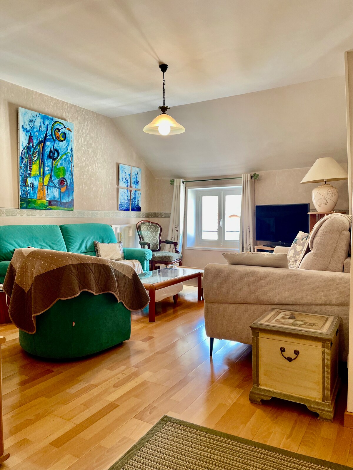 El apartamento independiente de 37 m2 está situado en el centro de la ciudad de Chagny, en el primer piso de nuestra vivienda. Tiene un dormitorio con sábanas, baño con toallas, una sala de estar con un sofá, 3 ventiladores de techo y mosquiteros. La cocina está equipada con horno+microondas, nevera, cafetera espresso. Hay todos los comercios en las inmediaciones, el mercado los domingos por la mañana a 90 m, la estación de tren a 200 m, el restaurante Lameloise está a 120 m, así como otros restaurantes.