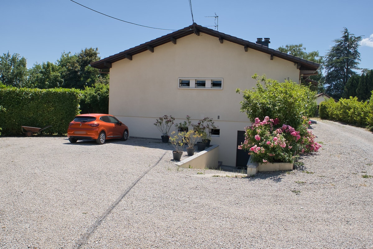 Studio semi-enterré de 35m² à l'ambiance calme et chaleureuse d'un chalet au pied du Jura, proche de la frontière suisse (15 minutes de Meyrin, 30 minutes de Genève et du Télécabine du Fierney (19 minutes). Il comprend tous les équipements nécessaires à votre séjour : wifi, salle de bains, cuisine équipée (four, frigo, plaques induction), machine à laver. Petite terrasse privative à l'extérieur avec table et chaises (accès par l'extérieur). Parking gratuit sur place.