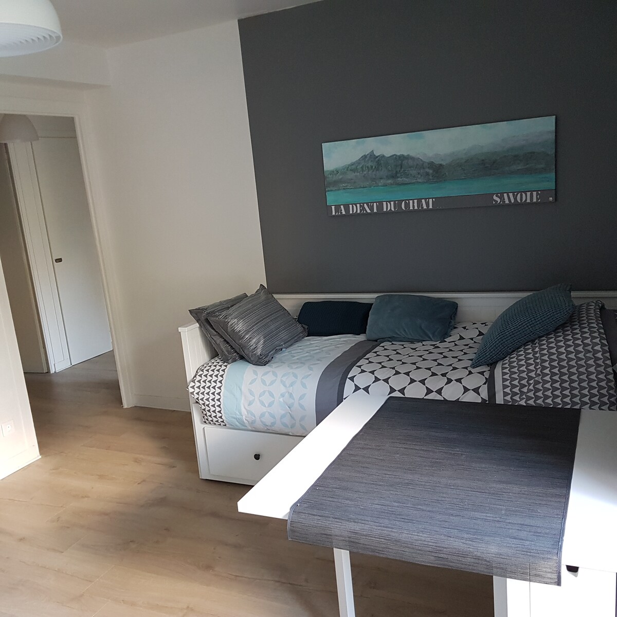 Estudio totalmente equipado, muy acogedor, tranquilo, luminoso, con una hermosa vista del Revard y un edificio protegido. Se proporciona una plaza de estacionamiento privada. Situado a 8 minutos a pie del centro de la ciudad, una parada de autobús a 5 minutos también permite llegar a la orilla del lago o a las Termas. Además, disfrutarás de acceso a la piscina de la copropiedad durante los períodos de verano, así como acceso durante todo el año a la cancha de tenis. El apartamento ofrece WIFI.