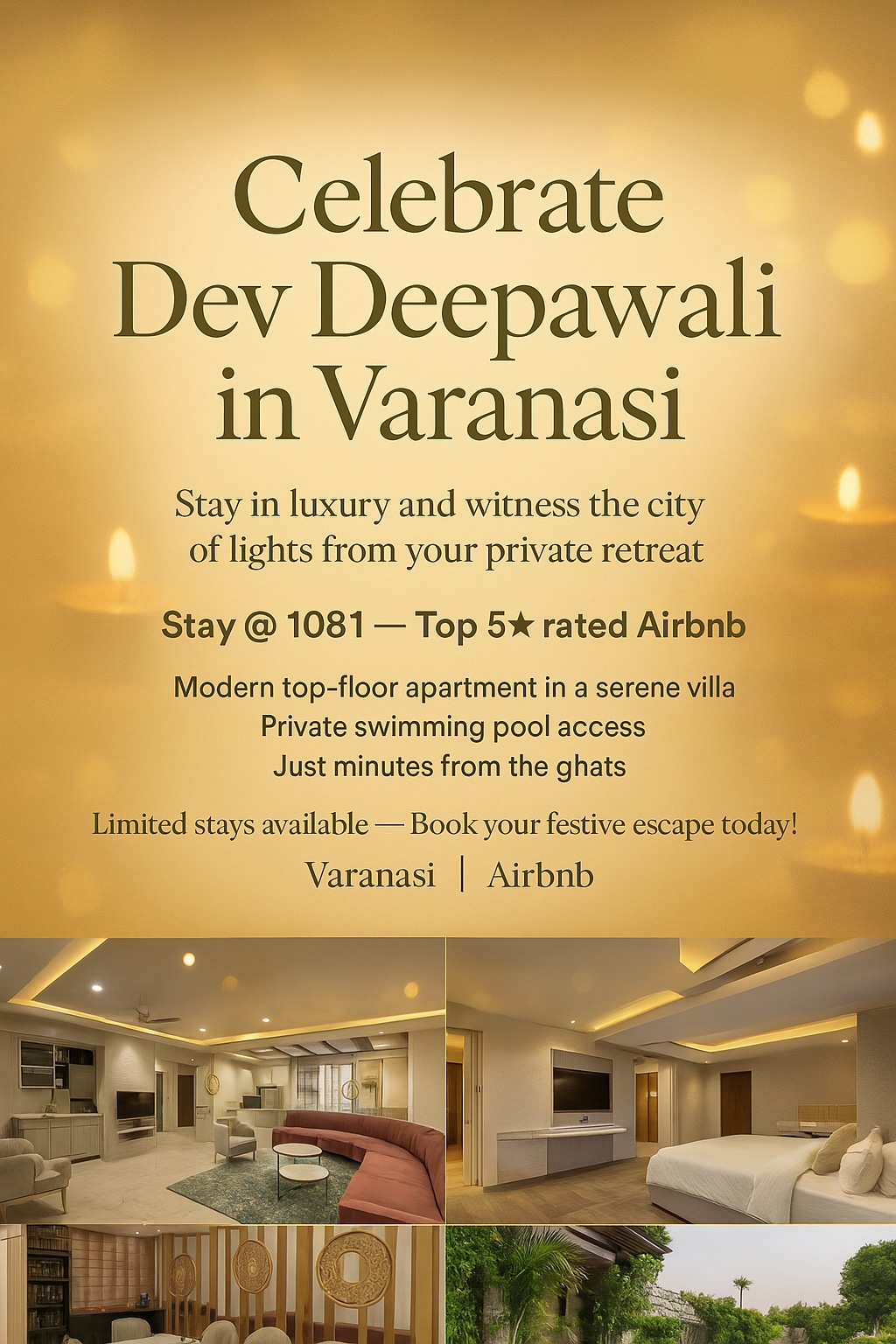 ¡Namasté! ¡Bienvenido a tu hogar lejos de casa en Varanasi! Espacio privado de lujo con jardín en la azotea. Perfectamente ubicado a menos de 20 minutos de los sitios emblemáticos de Varanasi (templo Shri Kashi Vishwanath y Ghats), este espacio ofrece una cama tamaño king, una cocina totalmente equipada, wifi, un gran televisor Android y una amplia terraza para relajarse o practicar yoga. Ya sea que estés aquí para explorar, meditar o simplemente relajarte, esperamos que te sientas como en casa y te vayas con una sensación de rejuvenecimiento.