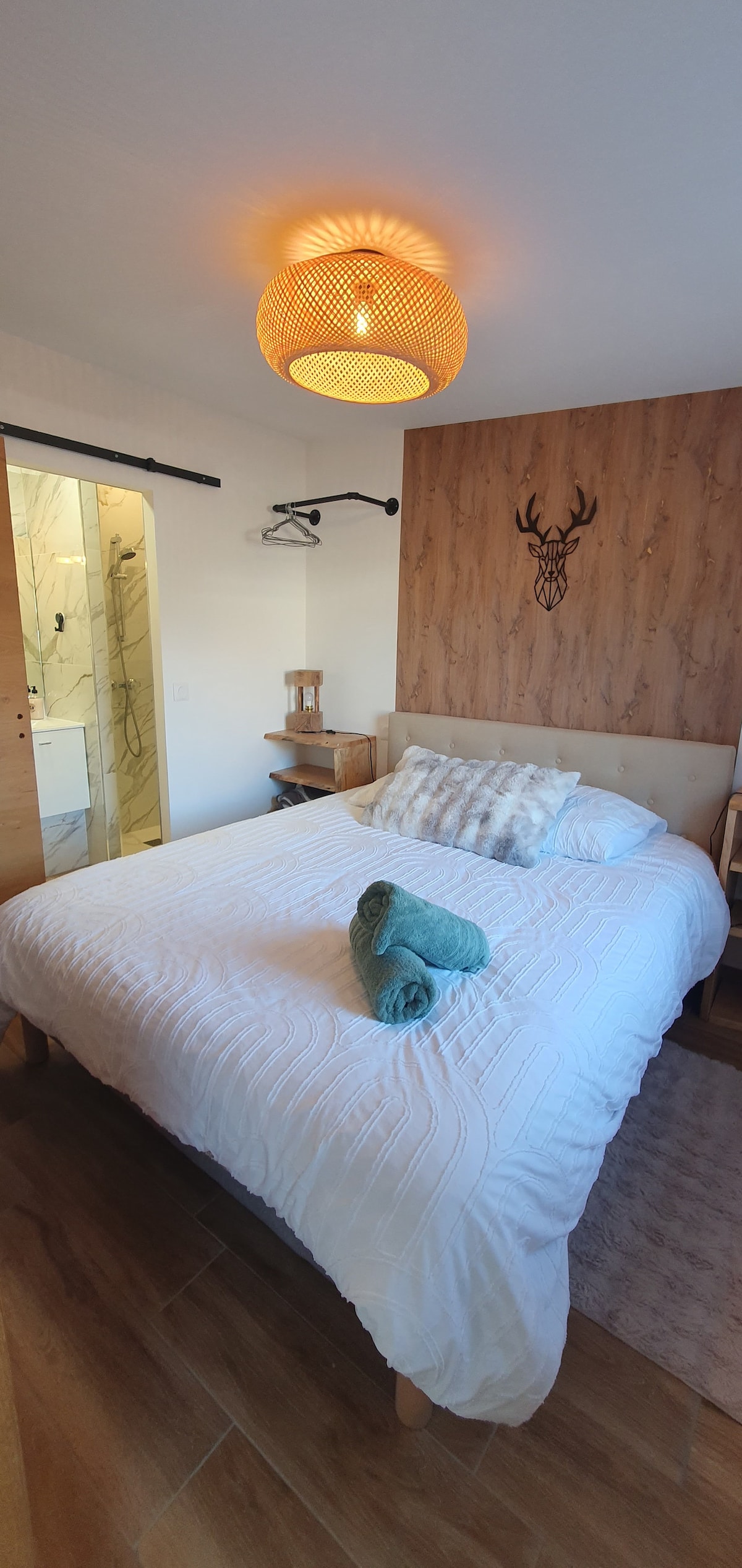 Chambre champêtre avec un grand lit et petit lit