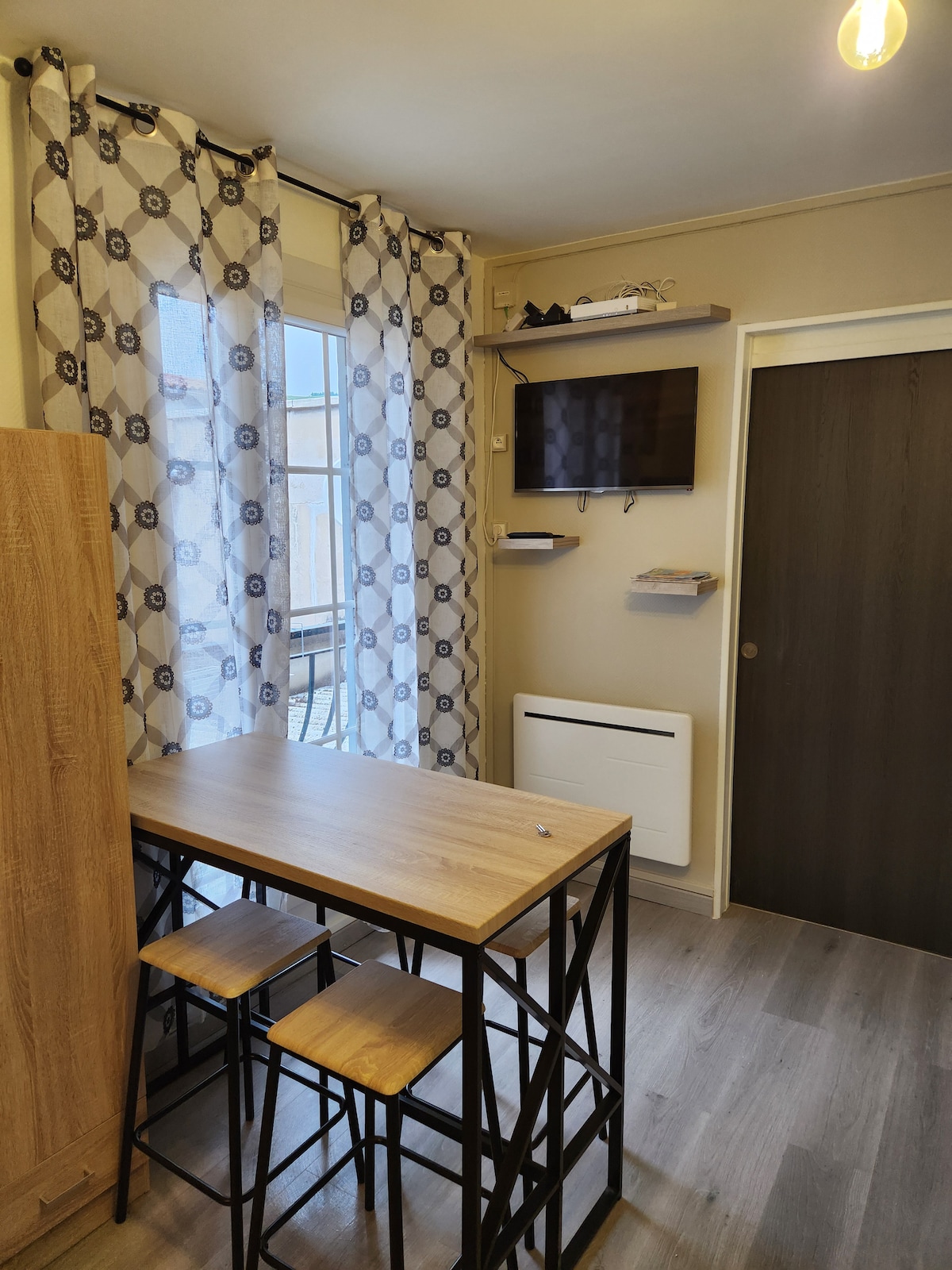 Relájese en este alojamiento con aire acondicionado, a pie, tranquilo y elegante. Entrada independiente autónoma. Este estudio, con instalaciones modernas, será su burbuja de descanso. Gran ducha de azulejos, cocina americana + vitrocerámica, nevera, armario y armario le hará la estancia agradable. Las persianas automáticas, las mosquiteras integradas y el ventilador central aumentarán su bienestar. Coche, motocicletas, bicicletas en el patio seguro, enchufe eléctrico para recargar bicicletas.