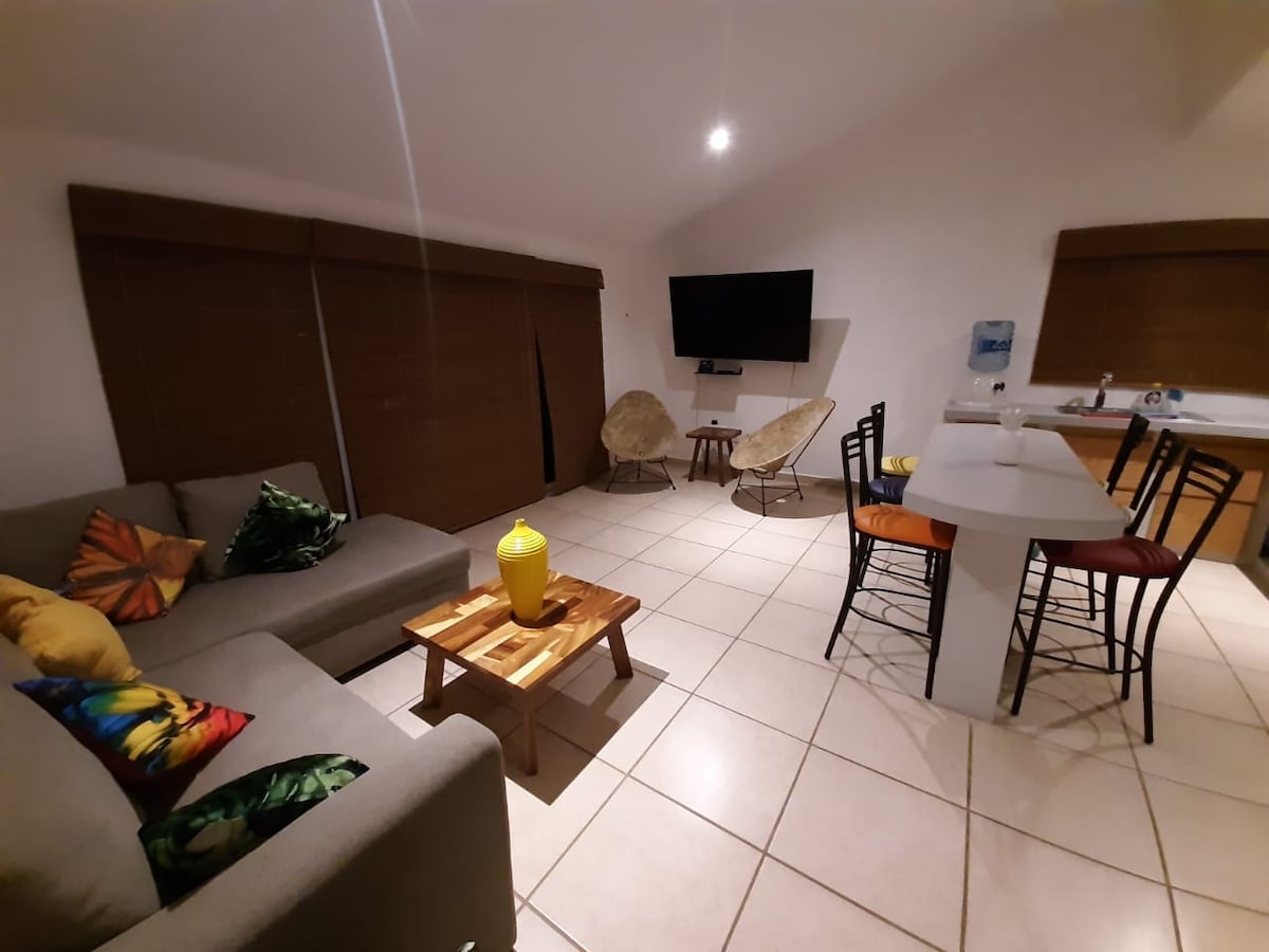Beautiful and spacious apartment with view from third floor. Kitchen is fully equipped and has an electric induction grill for your safety. The apartment is part of a residential area (Club Residencial Riberas del Chante) that grants 24-hour security and the use of pool, wading pool, jacuzzi (over 18 years old) grill, football field, tennis and basketball court. In the living room there is a TV with Total Play.