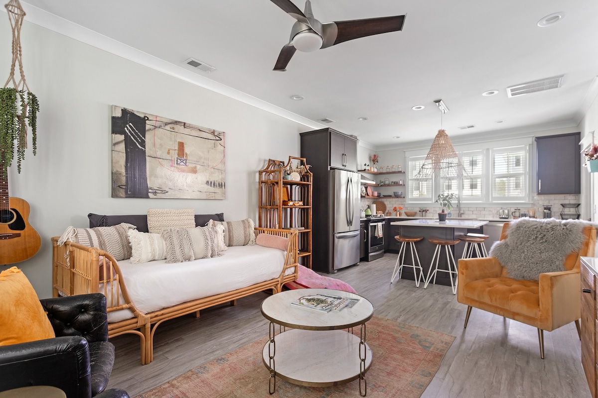 *Jungalow bohemio en el centro* Camina hasta los restaurantes, tiendas y vida nocturna de East Bay, así como hasta el histórico mercado de la ciudad, el parque frente al mar y todo lo que el centro de Charleston tiene para explorar. Ven y escápate a este espacio inspirado en Jungalow diseñado solo para ti. Relájate en esta tranquila casa de campo de 1800, pero céntrica. Cocina en esta cocina totalmente equipada. Y relájate con tu cóctel favorito en el espacio al aire libre equipado para asar y descansar. Se admiten mascotas.