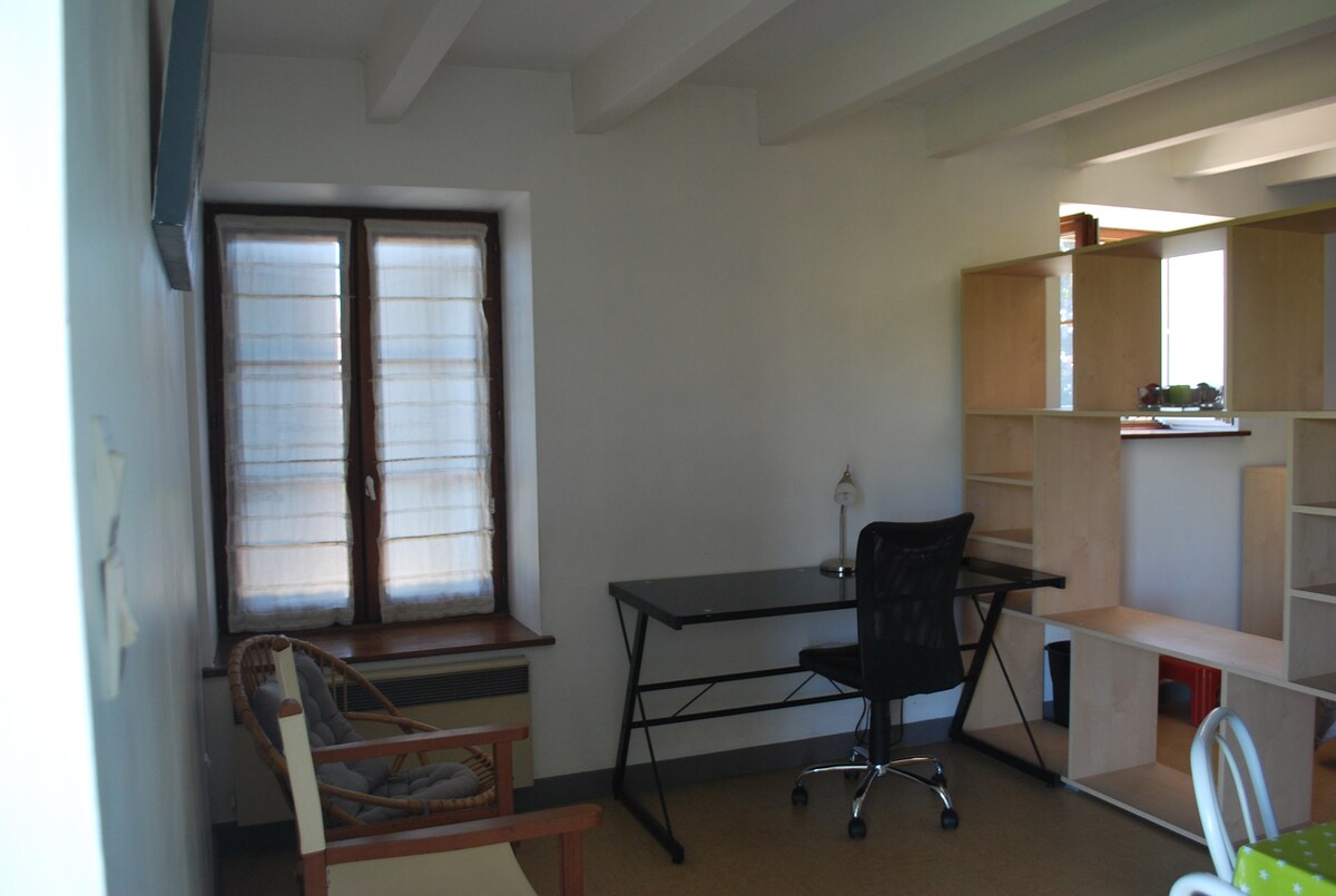 Studio très lumineux de 30m2, tout équipé, à 500m d'Intermarché, proche de la zone industrielle et à 2km de l'autoroute. Au 4ème et dernier étage (ascenseur), disposant d'une grande terrasse orientée sud ouest pour profiter du coucher de soleil Parking gratuit libre sécurisé fermé Accès en toute autonomie (code portail, digicode immeuble, boîte à clé) Wifi Dressing TV Cuisine équipée(café moulu, thé, sel, poivre, huile) Coin nuit Sdb(lave linge,gel douche,shamp) Drap, couette, serviettes fournis