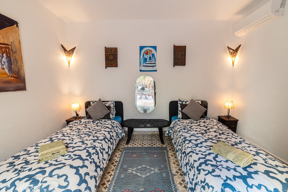 Descubre la combinación perfecta de comodidad y tranquilidad en nuestro encantador Airbnb ubicado en el corazón de la vibrante Medina. Sumérgete en la experiencia local con tiendas, cafés y restaurantes a solo unos pasos. Mi oasis en la planta baja cuenta con un ambiente soleado, muebles tradicionales con internet rápido, un dormitorio privado con una cama tamaño king, una amplia sala de estar con tres cómodos sofás cama, una cocina bien equipada, un encantador patio y un baño privado.