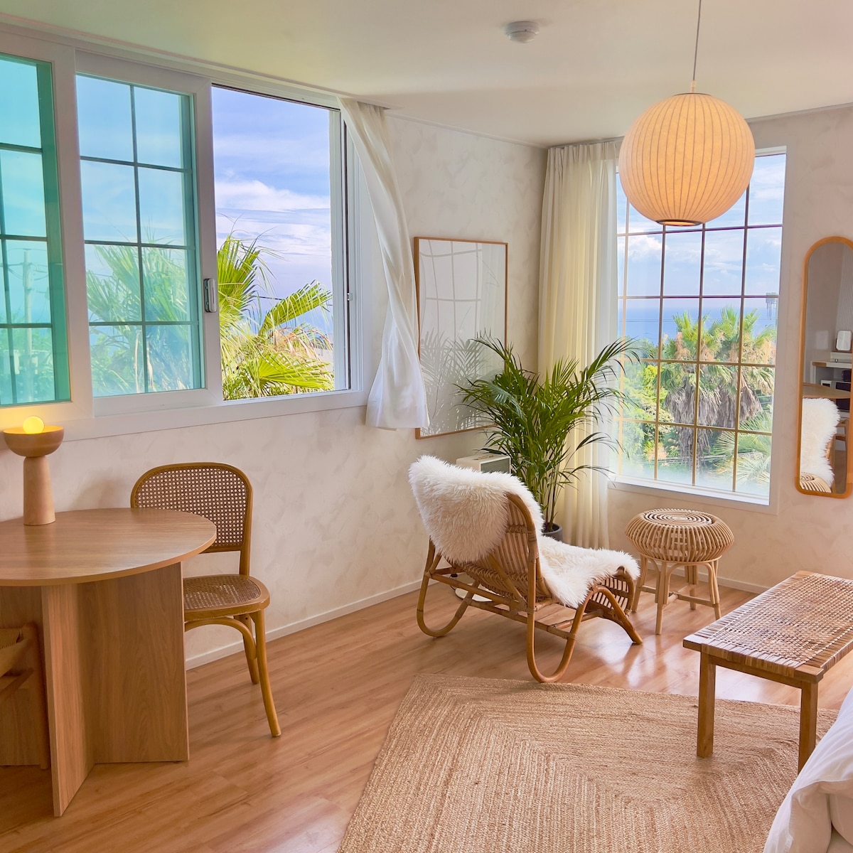 시옷홈은 쉼, 로컬 경험, 그리고 잔잔한 교류를 원하는 조용한 여행자들을 따뜻하게 맞이합니다. 단 2개만 운영중인 모든 객실은 호텔보다 깔끔하고 아늑하며, 아침마다 제주 바다와 귤밭의 아름다움을 눈에 담으실수있는 탁 트인 오션뷰를 제공합니다. 일본에서 수입한 고급 히노끼 나무로 천정과 벽면을 감싼 이 방의 침실에선 아무리 예민한 게스트분들도 아기처럼 깊은 잠을 주무실수 있답니다. 그래서 게스트분들이 이 방에 '꿀잠방'이라는 애칭을 붙여주셨어요. 이 방은 독립적인 출입문과 작은 주방, 욕실이 딸려있는 스위트룸입니다. 주방앞 별도의 문을 통해 멋진 바다뷰의 공용 다이닝룸(메인 사진속 화이트 공간)으로 바로 가실수 있고, 이곳에서 호스트가 매일 아침 내린 커피와 신선한 바게뜨, 샐러드로 아침식사를 준비해드립니다. 또한 원하시면 언제든지 이 멋진뷰의 다이닝룸에서 하루종일 재즈음악을 들으며 책을 보시거나, 간단한 음식과 와인을 즐기실 수 있습니다.