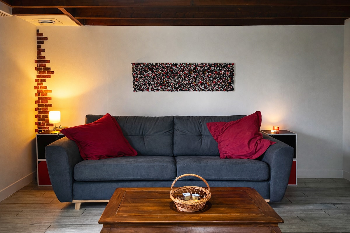 Amis voyageurs, laissez-vous tenter par cette charmante maisonnette ! Vous trouverez à votre disposition au rez-de-chaussée une cuisine équipée (micro-onde combiné, cafetière, plaques, ustensiles, lave-vaisselle, café/thé, etc...), salon avec TV, Wi-Fi et Hifi Bluetooth ainsi qu'un BZ confortable. À l'étage une chambre avec lit double + rangements, ainsi qu'une coquette salle d'eau. Parking privé, prise pour V.E. Bus et commerces non loin (pharmacie, épicerie, magasins, grandes surfaces..).