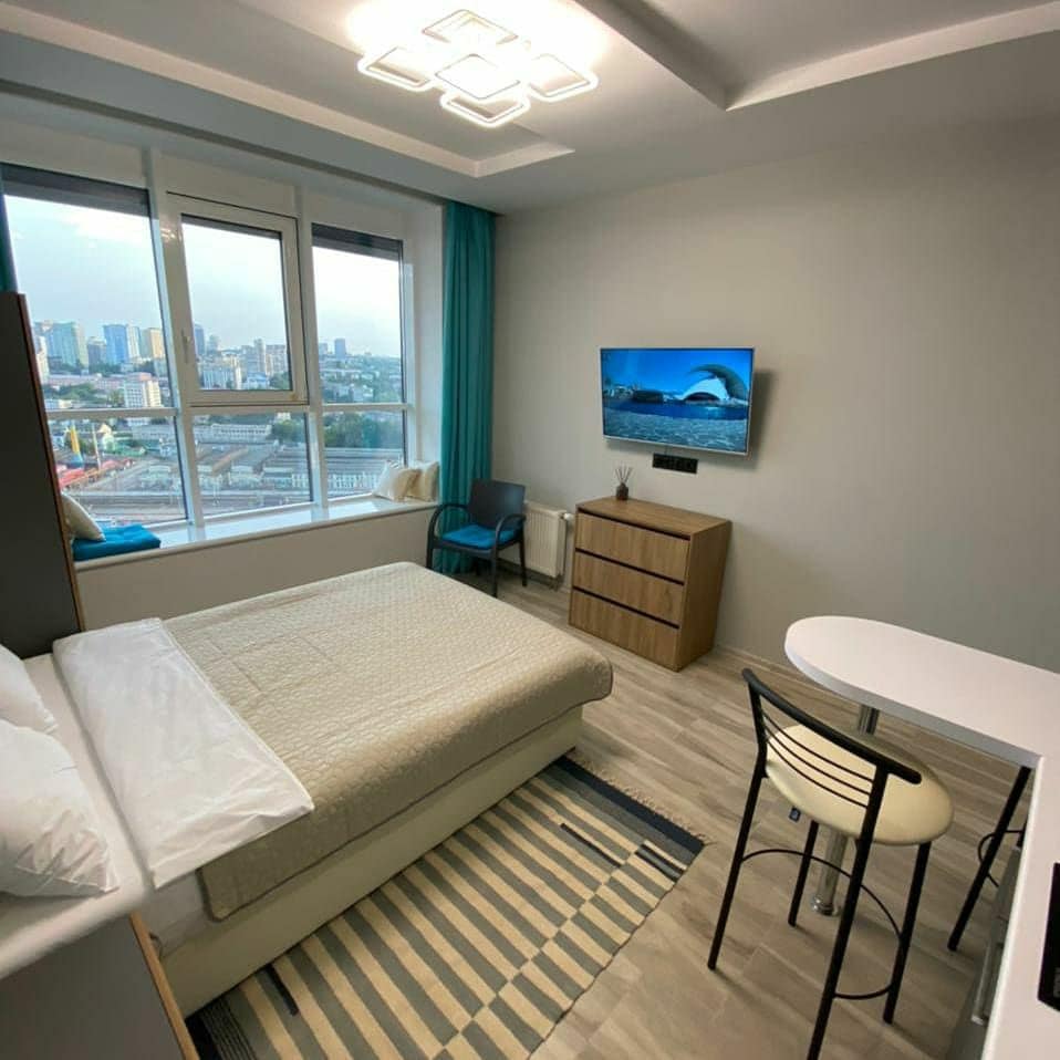 Los modernos apartamentos tipo estudio se encuentran en un edificio nuevo en el piso 25, cerca de la Plaza de la Victoria en Kiev. El edificio se encuentra a poca distancia a pie del centro de la ciudad y de las estaciones de metro Vokzalnaya y la Universidad. Lo más destacado del apartamento es el increíble accesorio del centro de la ciudad a vista de pájaro.